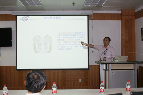 等离子体所所长李建刚从“人造太阳”的由来说起,向陈希一行介绍了核聚变的原理以及EAST的建设和科研进展情况。他介绍说,东方超环实验装置是等离子体所自主研制的国家大科学装置,自2006年9月EAST成功获得等离子体以来,EAST正稳步向其三大科学目标靠近,即一兆安、1000秒、一亿度。近期,EAST还成功地获得超过400秒的两千万度高参数偏滤器等离子体以及获得稳定重复超过30秒的高约束等离子体放电,创造了两项世界纪录。